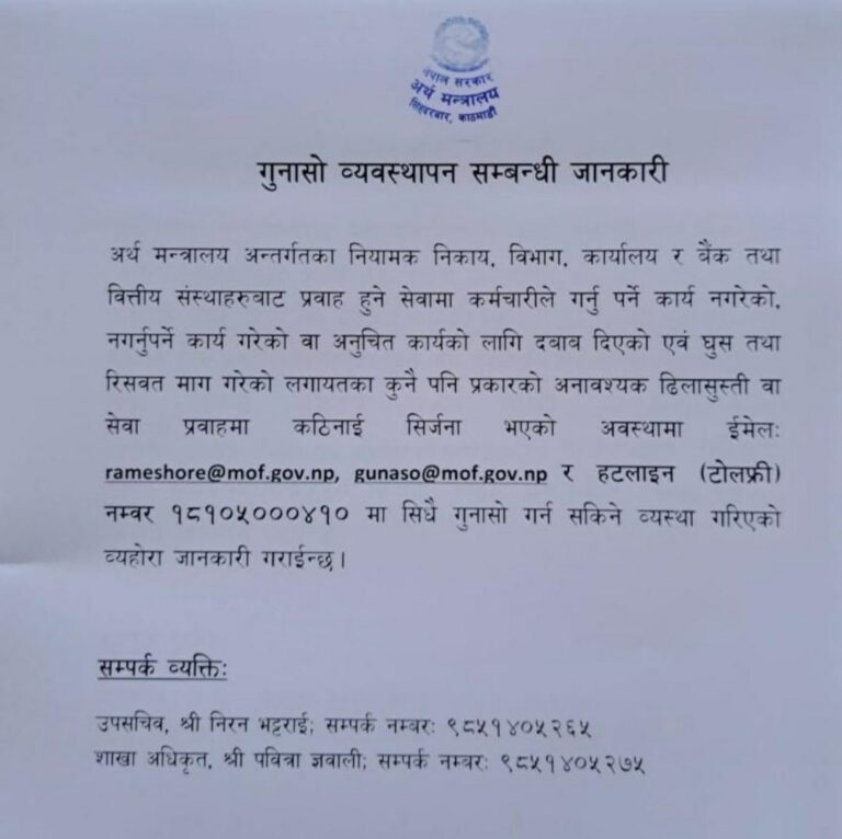 मन्त्रालयले मन्त्रालयकै उपसचिव निरज भट्टराई र शाखा अधिकृत पवित्रा ज्ञवालीलाई सम्पर्क व्यक्ति तोकेको हो । साथै मन्त्रालय दुई मेल समेत गुनासो गर्नका लागि खुला गरेको छ भने हटलाइन नम्बर समेत उपलब्ध गराएको छ ।
