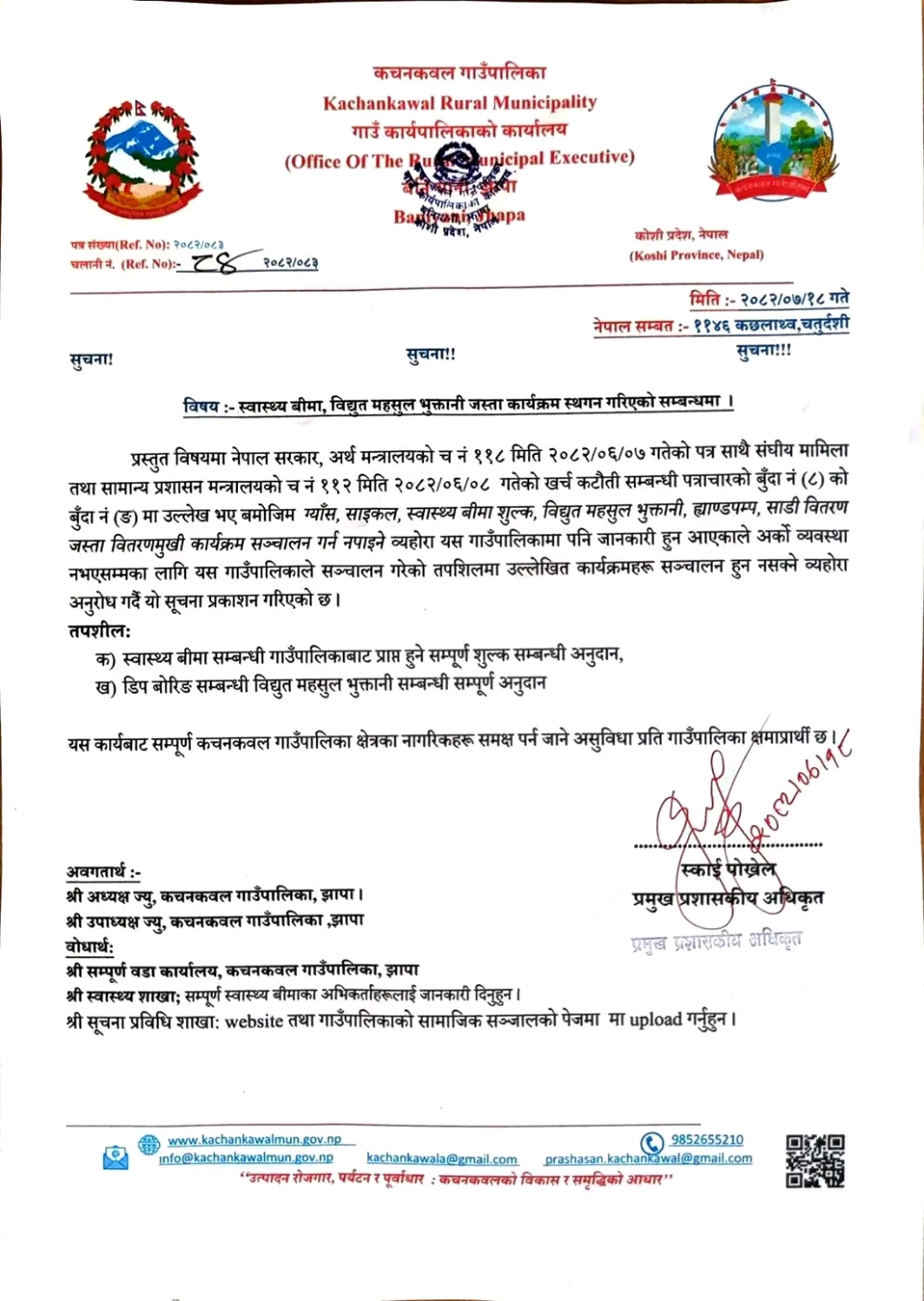 कचनकवल। कचनकवल गाउँपालिकाले संघीय सरकारको खर्च कटौती सम्बन्धी निर्देशनका कारण स्वास्थ्य बीमा शुल्क र विद्युत महसुल भुक्तानीजस्ता वितरणमुखी कार्यक्रमहरू स्थगन गर्ने निर्णय गरेको छ।
