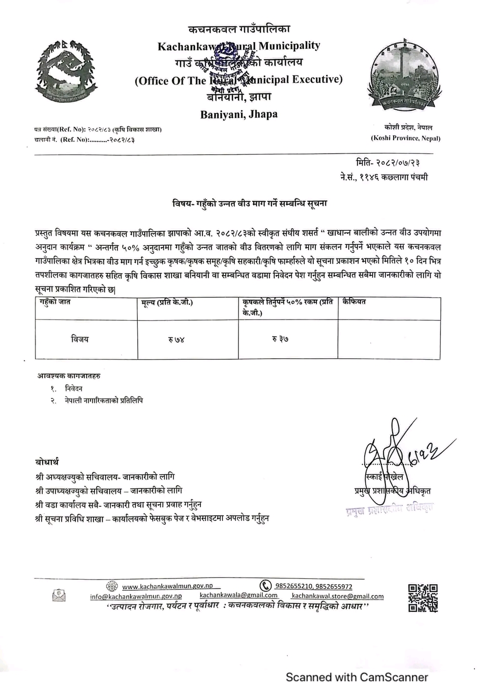 बनियानी। कचनकवल गाउँपालिकाले आगामी मौसमी खेतीलाई लक्षित गर्दै गहुँको उन्नत जातका बीउमा ५० प्रतिशत अनुदान दिने निर्णय गरेको छ।