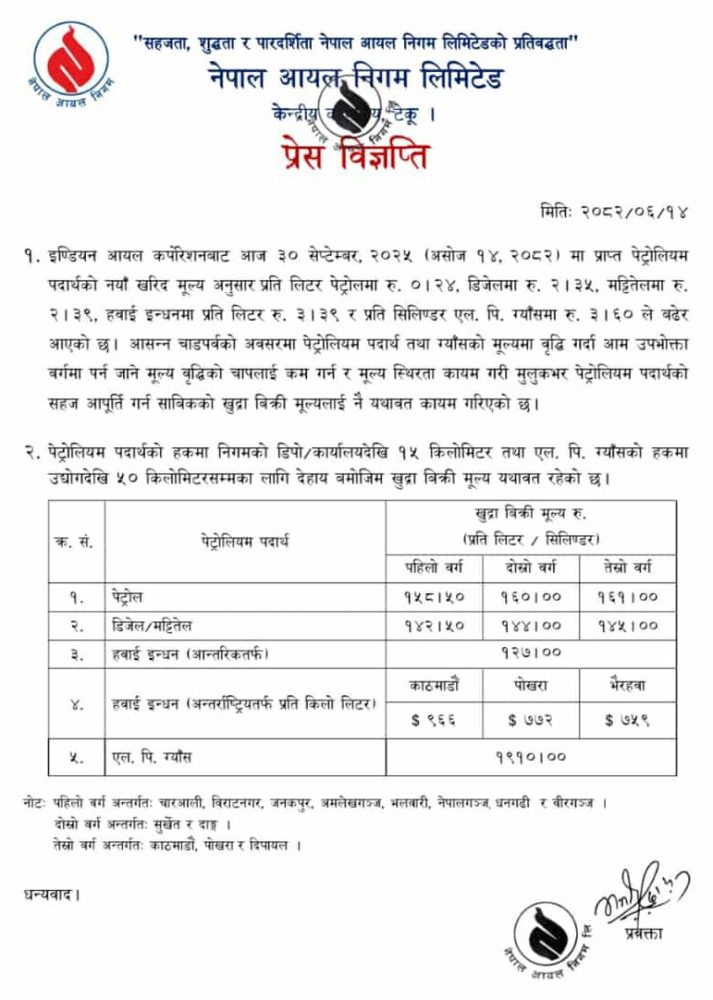 निगमका अनुसार भारतीय आयल कर्पोरेशनबाट पेट्रोलमा प्रति लिटर ०.२४ पैसा, डिजेलमा २ रुपैयाँ ३५ पैसा, मट्टितेलमा २ रुपैयाँ ३९ पैसा, हवाई इन्धनमा प्रति लिटर ३ रुपैयाँ ३९ पैसा र एलपीजी ग्यासमा प्रति सिलिण्डर ३ रुपैयाँ ६० पैसा बढेको मूल्य सूची प्राप्त भएको छ ।