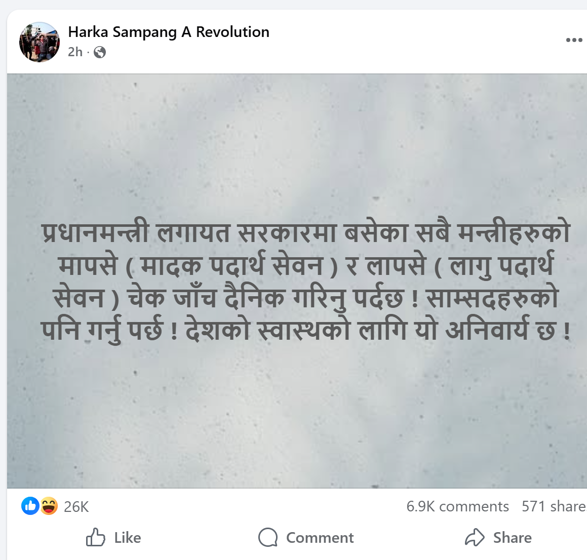 धरान । सुनसरी–१ बाट प्रतिनिधिसभामा निर्वाचित श्रम संस्कृति पार्टीका सर्वोच्च नेता तथा धरानका पूर्व मेयर हर्क साम्पाङ्गले प्रधानमन्त्रीदेखि मन्त्री र सांसदसम्म सबैको दैनिक रूपमा मादक पदार्थ (मापसे) र लागू पदार्थ (लापसे) सेवन परीक्षण गर्नुपर्ने माग गरेका छन्।