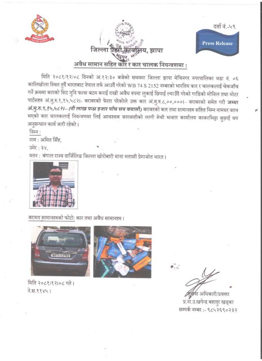 नियन्त्रणमा लिइएका चालक ३४ वर्षीय अमित सिंह रहेका छन्। सिंह भारत बंगालको दार्जिलिङका बासिन्दा हुन्। उनलाई मेचिनगर नगरपालिका–६ कालिखोला नजिकै भारतबाट नेपालतर्फ आउँदै गर्दा कारसहित पक्राउ गरिएको हो। डब्ल्यूबी ७४ एस २१५२ नम्बरको भारतीय कारलाई शुक्रबार दिउँसो चेकजाँच गर्ने क्रममा प्रहरीले अवैध सामान फेला पारेको थियो।