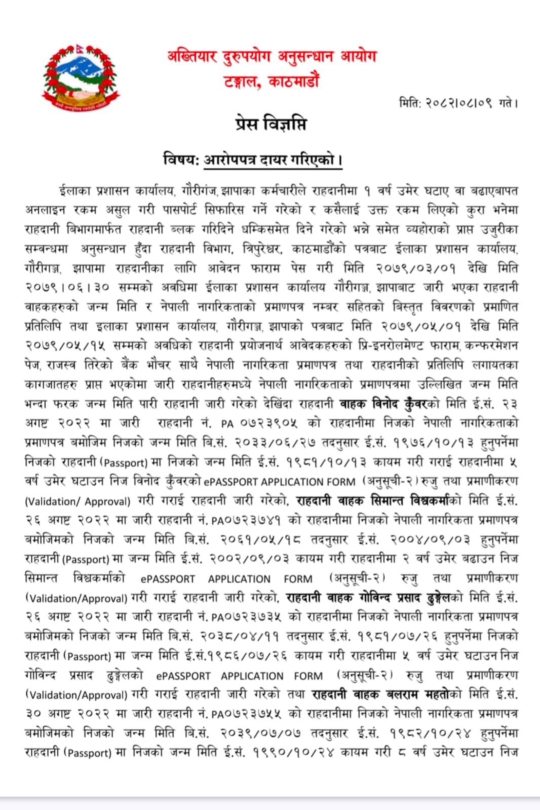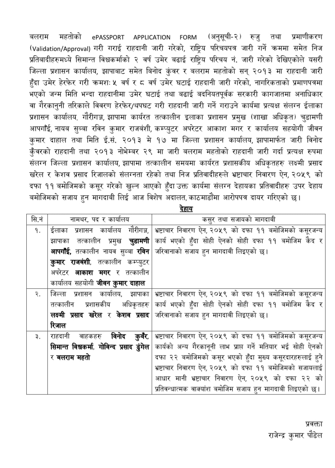 त्यस्तै जिल्ला प्रशासन कार्यालय झापाका तत्कालीन प्रशासन अधिकृत लक्ष्मीप्रसाद खरेल र केशवप्रसाद रिजाल तथा राहदानी बाहकहरू बिनोद कुँवर, सिमान्त विश्वकर्मा, गोविन्दप्रसाद ढुंगेल र बलराम महतोविरुद्ध पनि मुद्दा दर्ता गरिएको आयोगले जनाएको छ।