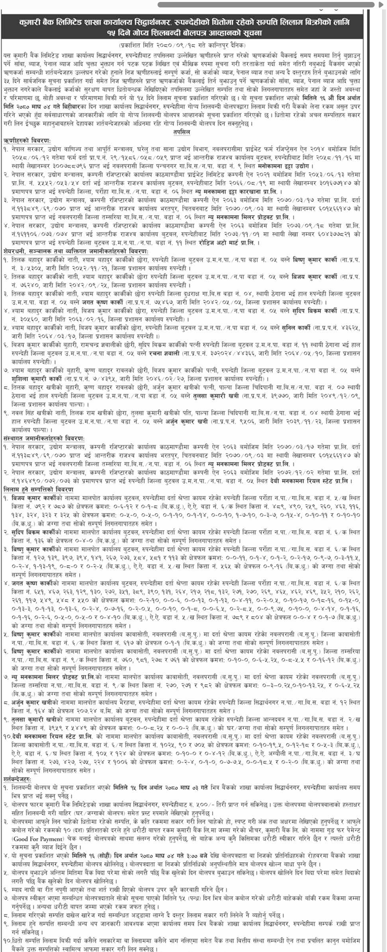 सांसद कार्कीको नाममा रहेको कम्पनी ‘न्यु मनकामना इट्टा कारखाना प्रा.लि.’ ले कुमारी बैंकबाट लिएको ऋण तिर्न नसकेपछि बैंकले धितो राखिएको सम्पत्ति लिलामी प्रक्रियामा अघि बढाएको छ । बैंकले २०८० पुस १८ गते कान्तिपुर दैनिकमा ३५ दिने सूचना प्रकाशित गरी ऋण भुक्तानी गर्न आग्रह गरेको थियो ।