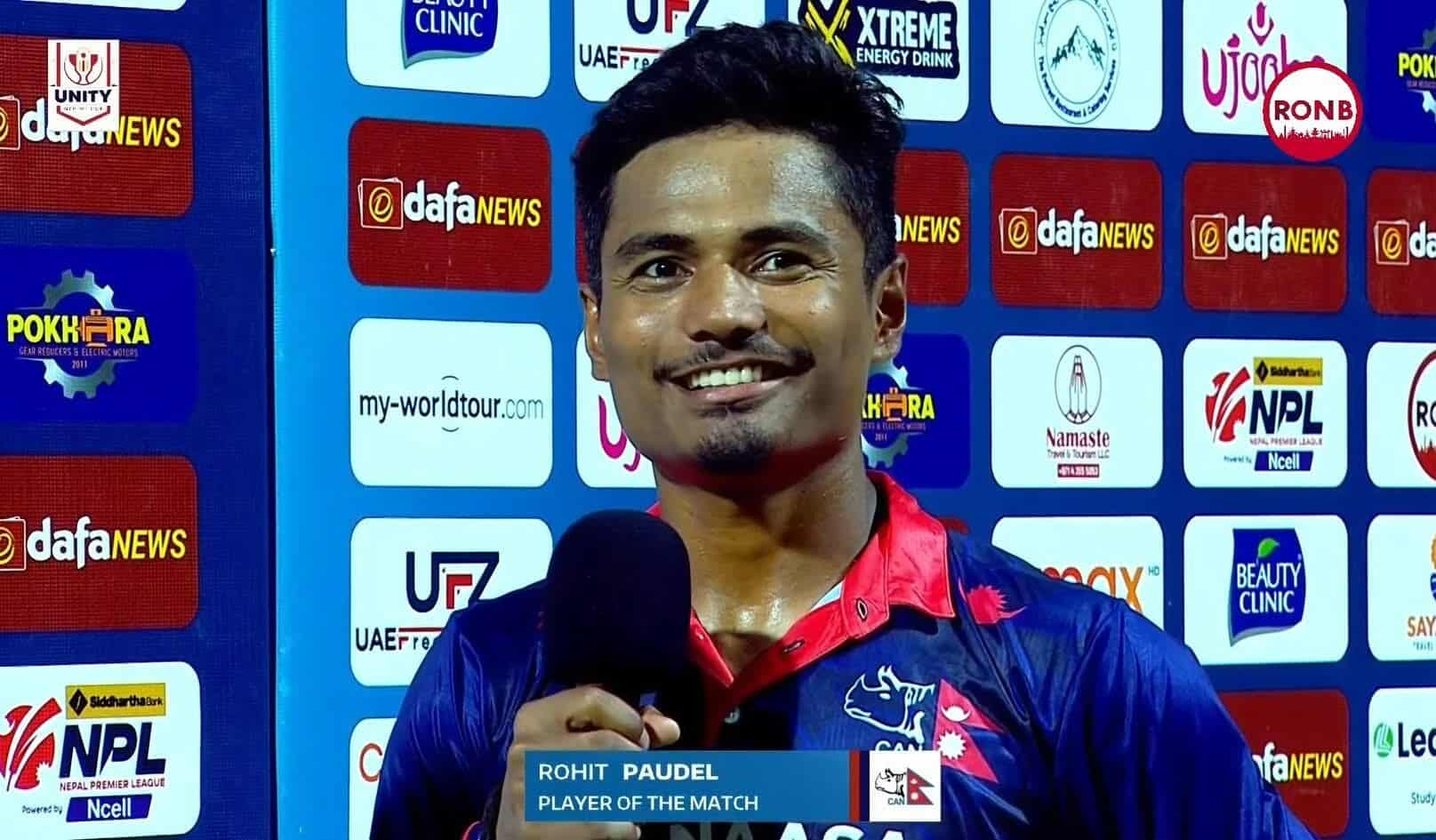 काठमाडौं । नेपालले वेस्ट इन्डिजविरूद्ध ऐतिहासिक जित दर्ता गर्दा कप्तान रोहित पौडेल प्लेयर अफ दि म्याच बनेका छन् । उनले